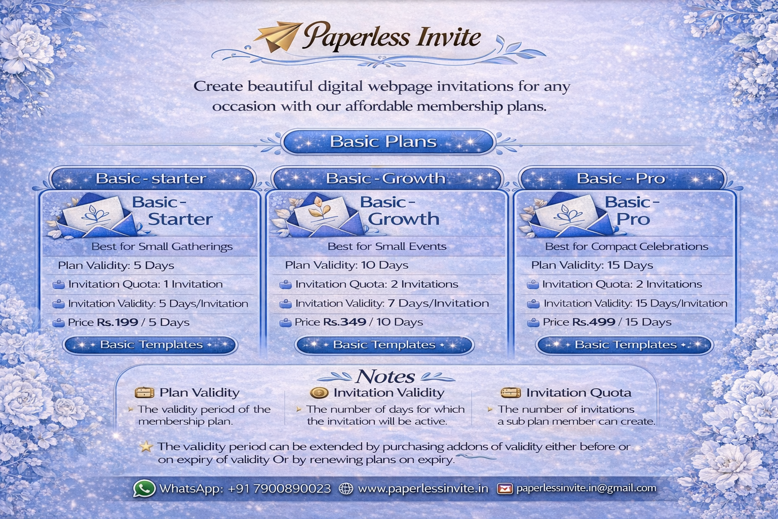 Plan validity is the number of days your membership remains active, during which you can create, edit, or update your invitations using the dashboard.