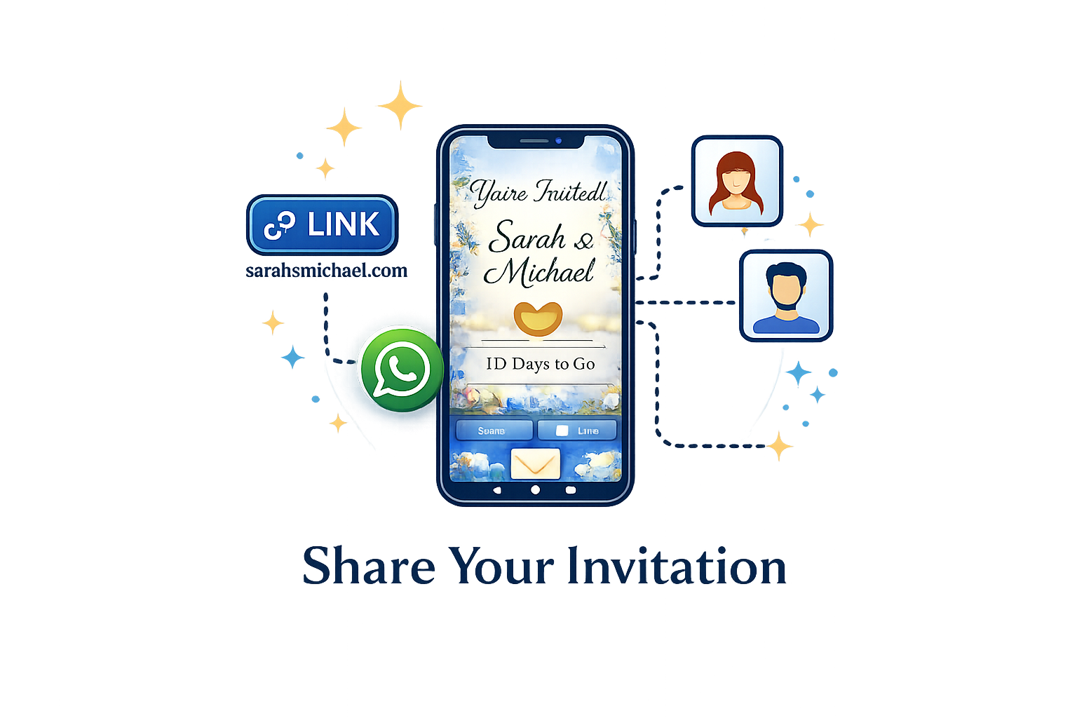 Share your invitation link instantly via WhatsApp or other sharing apps. For a more exclusive experience, generate personalized links with each guest’s name and share them individually.